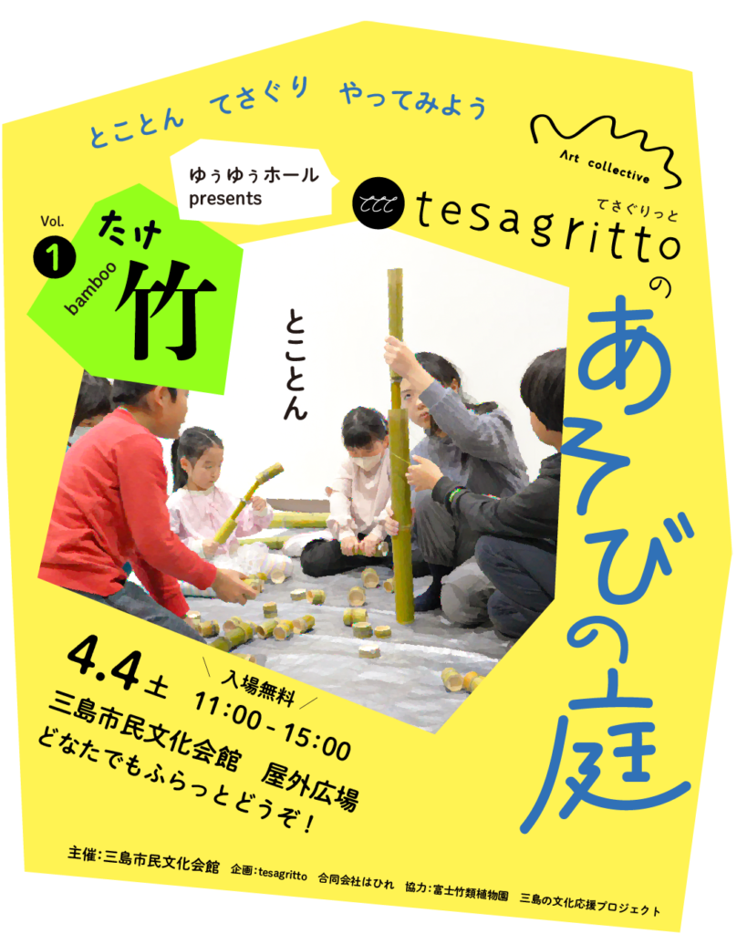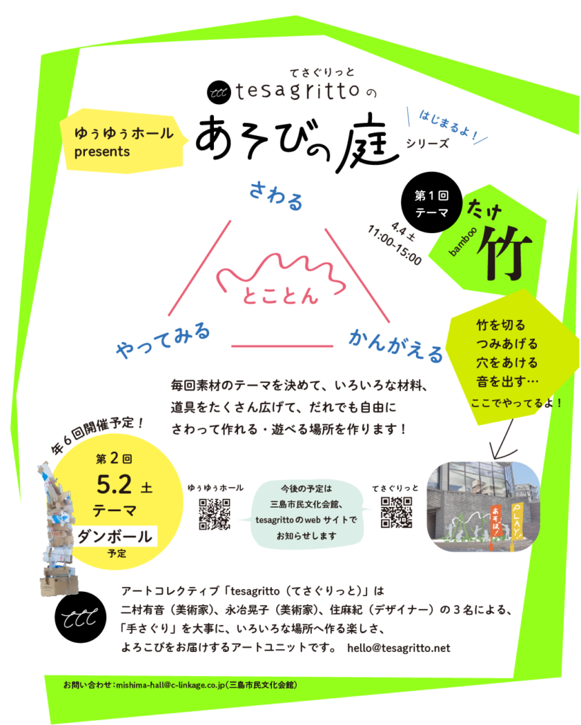 2025.10.302026.03.16 アートコレクティブ「tesagritto(てさぐりっと)」は二村有音(美術家)、永冶晃子(美術家)、住麻紀(デザイナー)の3名による、「手さぐり」を大事に、いろいろな場所へ作る楽しさ、よろこびをお届けするアートユニットです。 hello@tesagritto.net